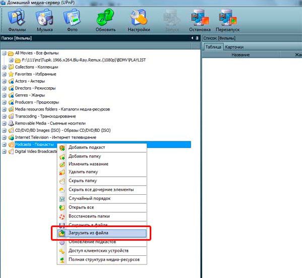 2. Запускаем программу Домашний медиа-сервер, переходим в закладку Фильмы, находим строчку Podcasts-Подкасты и нажимаем на нее правой кнопкой мышки, выбирае Загрузить из файла.